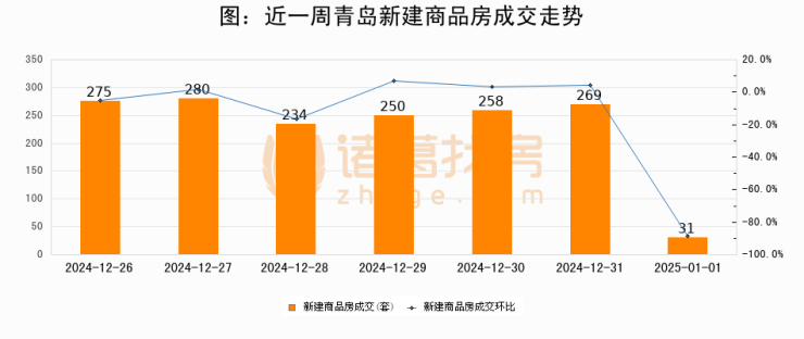 根据青岛市住房和城乡建设局数据显示,2025年01月01日青岛新建商品房成交31套,较昨日减少238套,环比下降88.5%