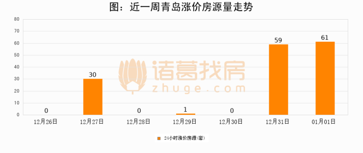 根据诸葛找房数据显示,青岛24小时涨价房源量为61套,较12月31日增加2套,环比上涨3.4%。与此同时,涨价房源占比小幅扩大,业主信心有所提升。