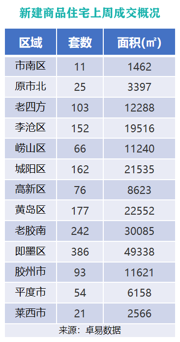 从各区成交情况来看,上周即墨区新建商品住宅以成交面积49338㎡的成绩,位列上周各片区新建商品住宅成交面积榜首位;原胶南市以成交面积30085㎡的成绩,位列成交面积榜第二位;原黄岛区以成交面积22552㎡的成绩,位列成交面积榜第三位。