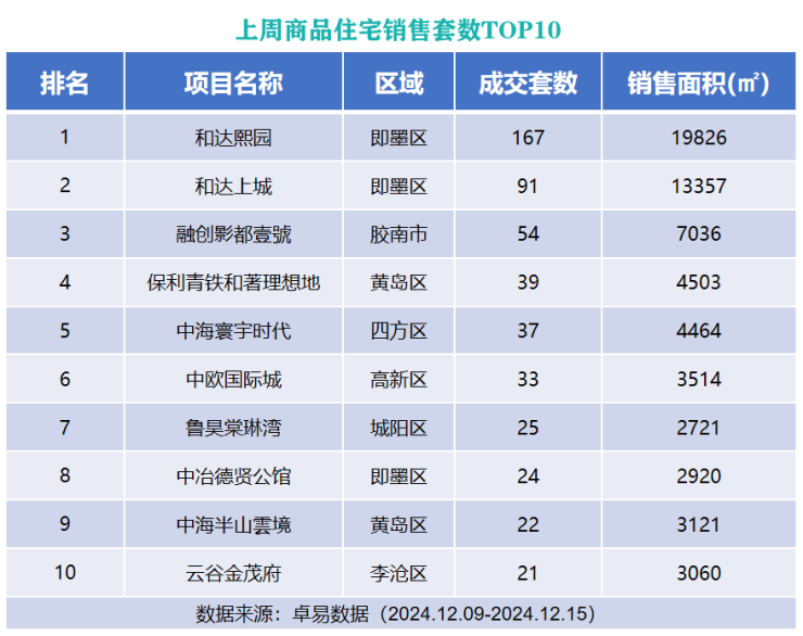 根据卓易数据统计,上周(12.9-12.15)青岛新建商品住宅成交1568套,环比下降5.03%;成交面积为20.04万㎡,环比上涨6.88%。