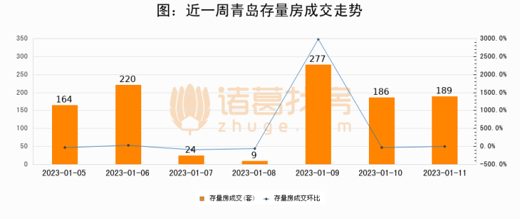 从存量房来看,2023年01月11日青岛存量房单日成交189套,比昨日增加3套,环比上涨1.6%。从近一周存量房成交来看,青岛存量房日均成交套数为152套,其中01月09日成交量最高为277套,01月11日单日成交189套,高于近一周平均水平24.3%。