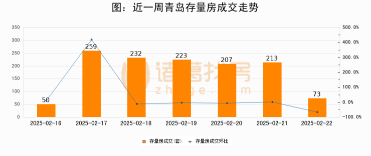从存量房来看,2025年02月22日青岛存量房单日成交73套,比昨日减少140套,环比下降65.7%。从近一周存量房成交来看,青岛存量房日均成交套数为179套,02月22日单日成交73套,低于近一周平均水平59.2%。