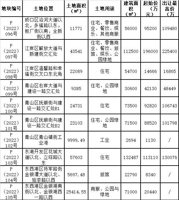 武汉市土地交易中心称,本批次地块注重项目品质,供应多宗核心片区优质宅地。一是位于硚口汉正街核心商业片的P(2022)096号地块,为近年来汉正街片鲜有的住宅地块,周边配套成熟,商业氛围浓厚。二是位于江岸区古德寺二期的P(2022)097号住宅地块,地处汉口历史风貌区,且毗邻二七滨江商务区,项目发展潜力大。三是位于青山区武粮库的P(2022)099号、100号及101号3宗住宅地块,地处青山一线临江席位,景观资源稀缺。