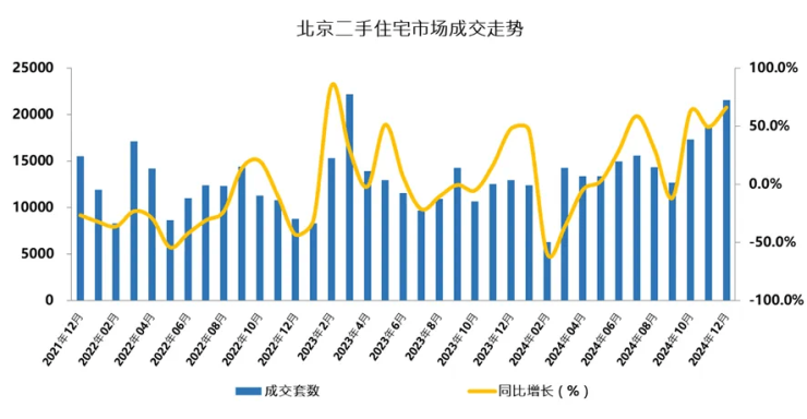 去年12月北京二手住房的网签量更是创下21个月新高。据北京市住建委的网签数据,2024年12月份,北京二手住宅网签量为21556套,环比增长15%,同比增长高达66%。这也是时隔21个月,北京全市二手住房网签量再次突破2万套。