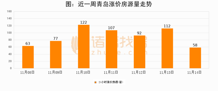 根据诸葛找房数据显示,青岛24小时涨价房源量为58套,较11月13日减少54套,环比下降48.2%。与此同时,涨价房源占比小幅回落,对于购房者来说是一个入市窗口期,购房者可抓住时机入市。