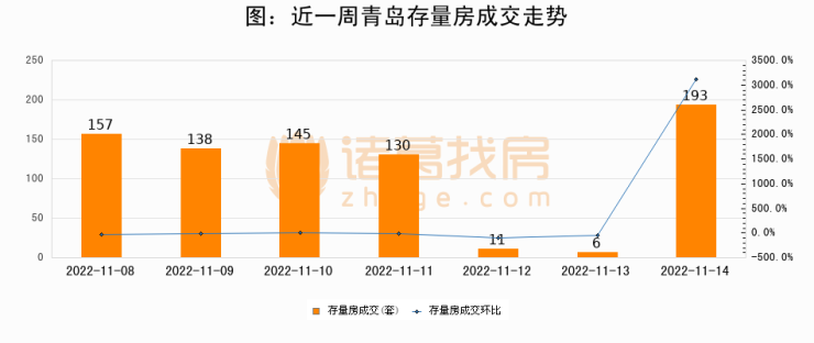 从存量房来看,2022年11月14日青岛存量房单日成交193套,比昨日增加187套,环比上涨3116.7%。从近一周存量房成交来看,青岛存量房日均成交套数为111套,其中11月14日成交量最高为193套,11月14日单日成交193套,高于近一周平均水平73.9%。