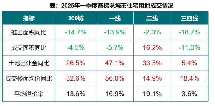 中指研究院数据显示,今年一季度300城住宅用地供应面积同比下滑14.7%。其中,一线城市推出住宅用地面积同比下滑13.9%,二线城市下滑2.3%,三、四线城市下滑18.7%。